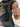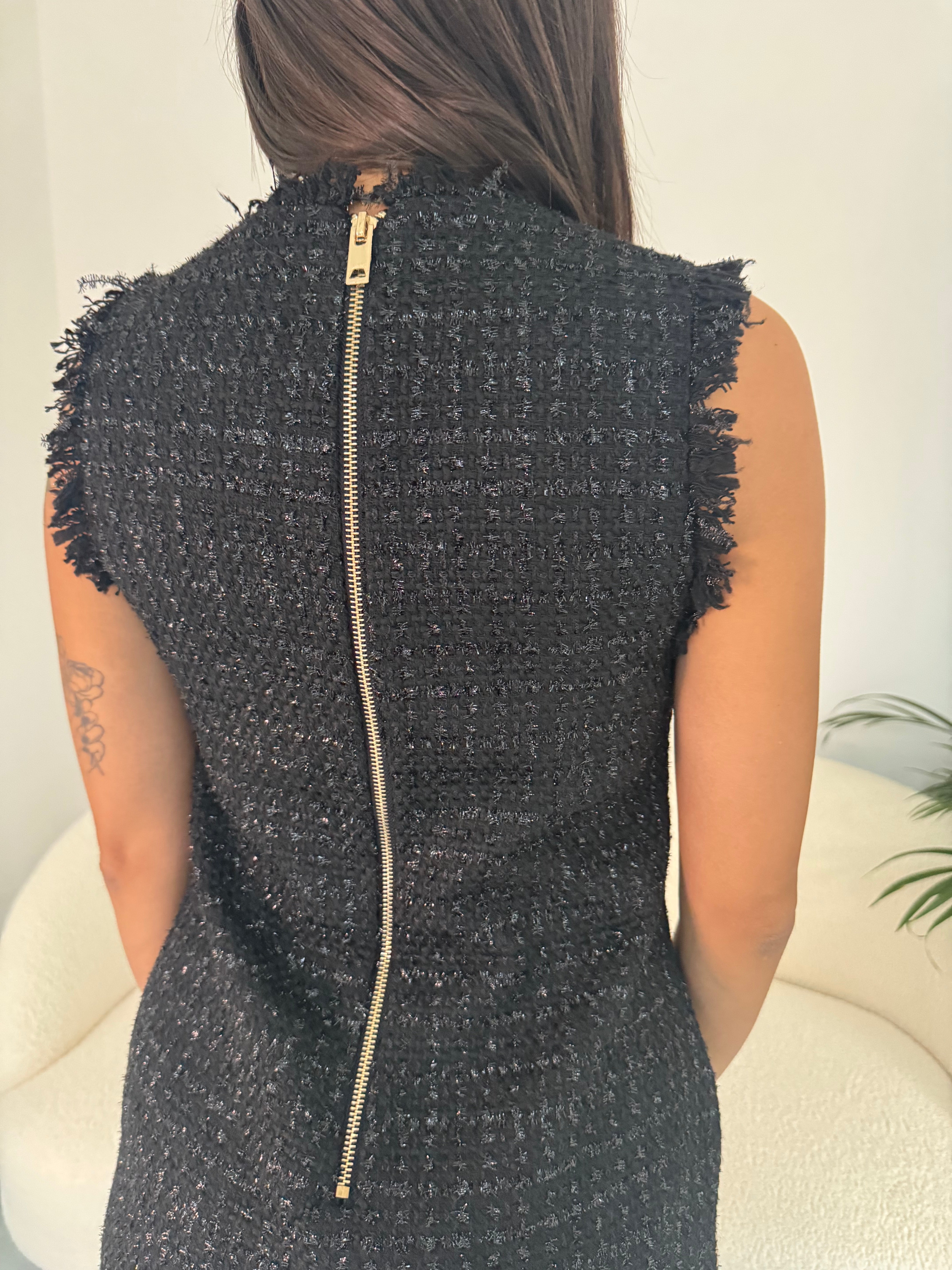 Tessuto nero strutturato con dettagli sfrangiati sul bordo.