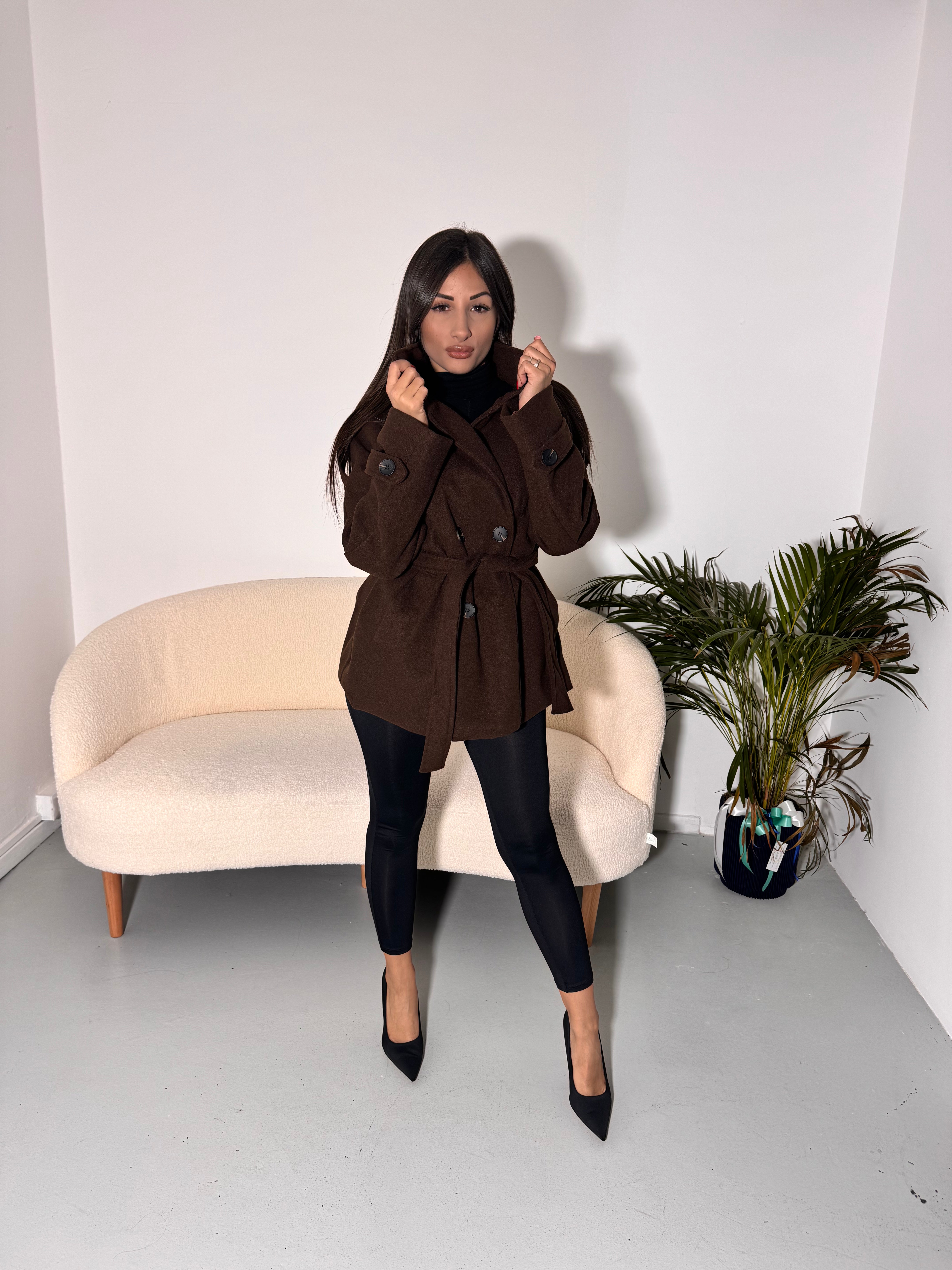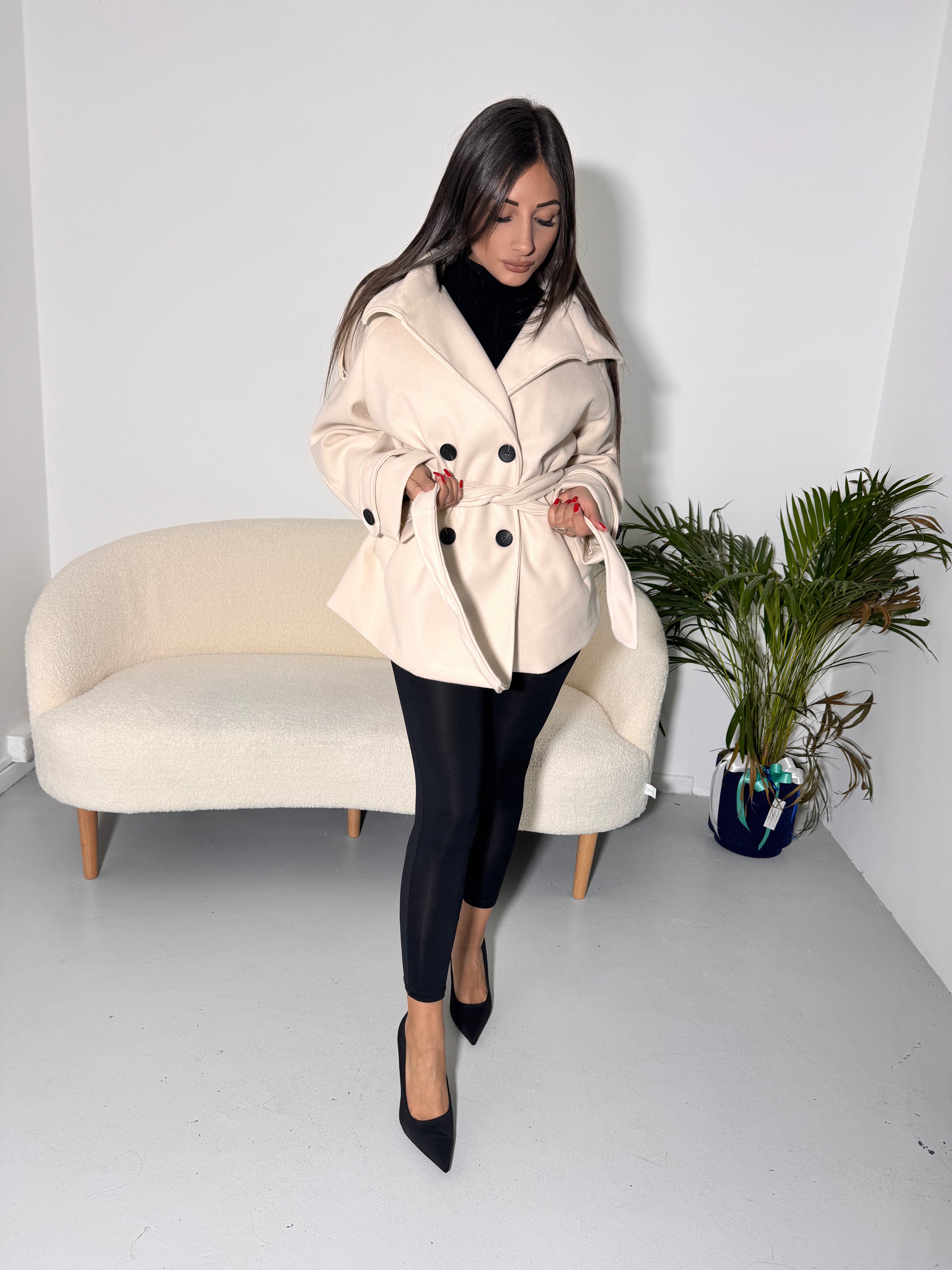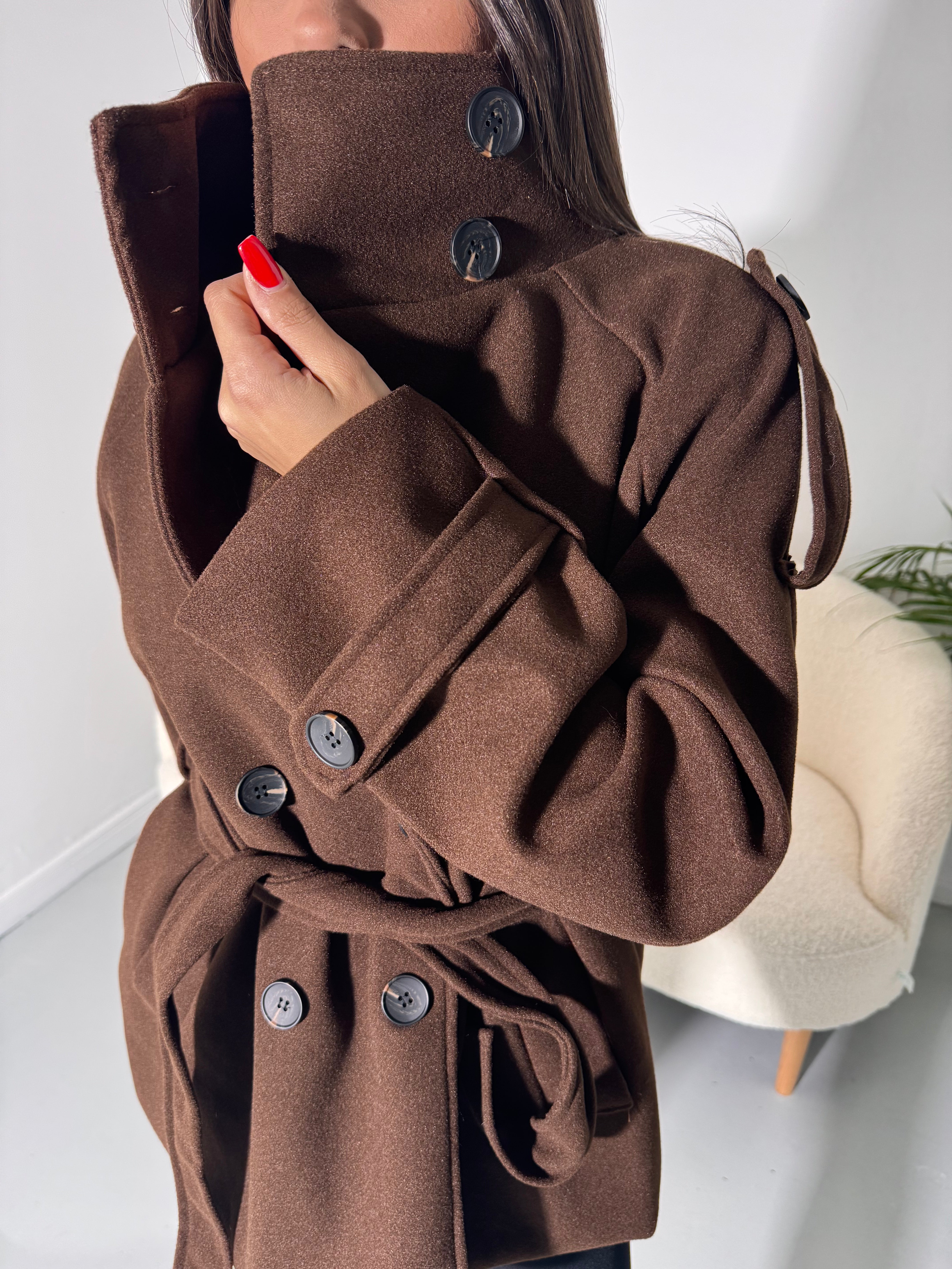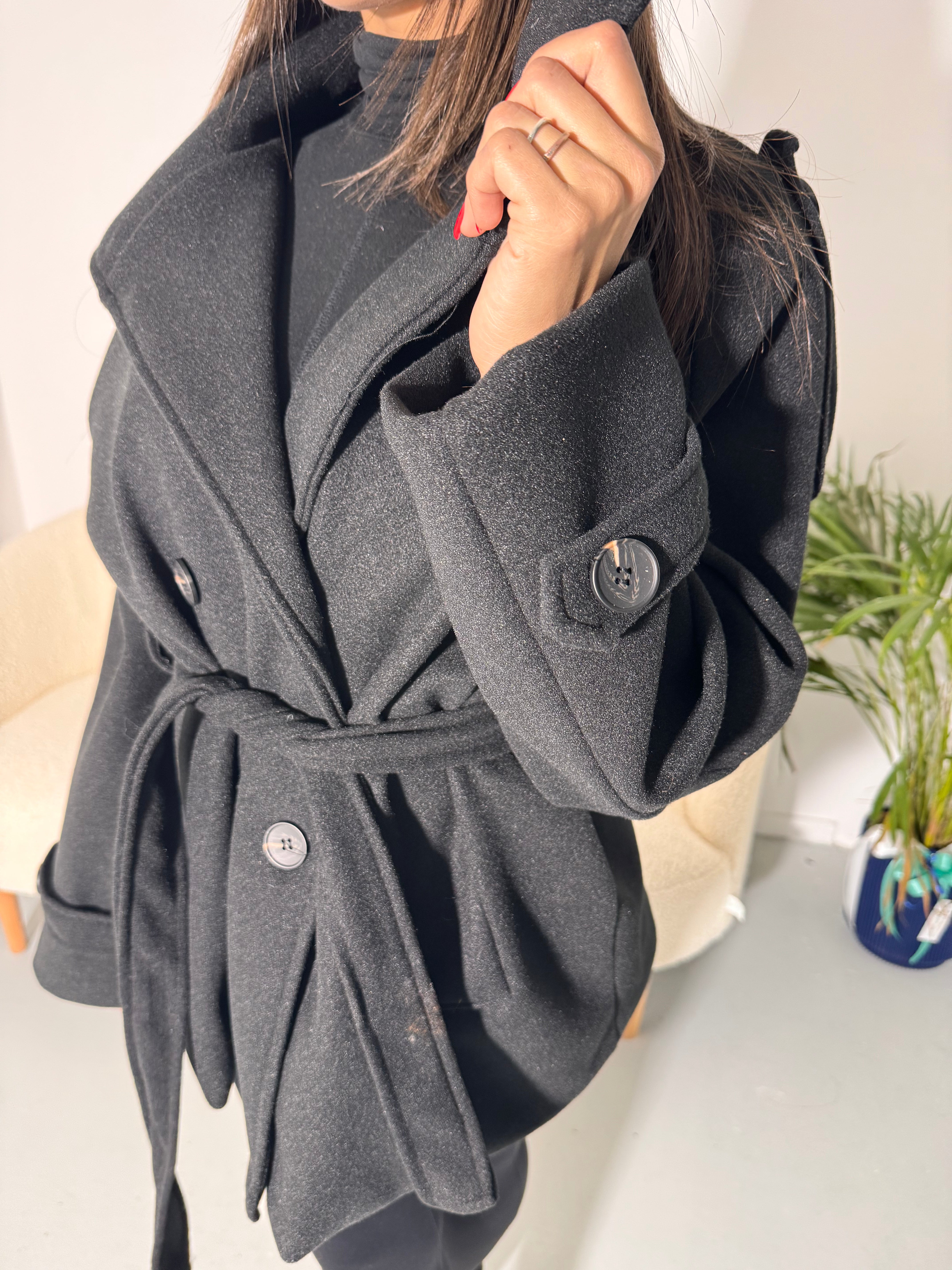 Cappotto doppiopetto, caldo e avvolgente, con cintura in vita per definire la silhouette.