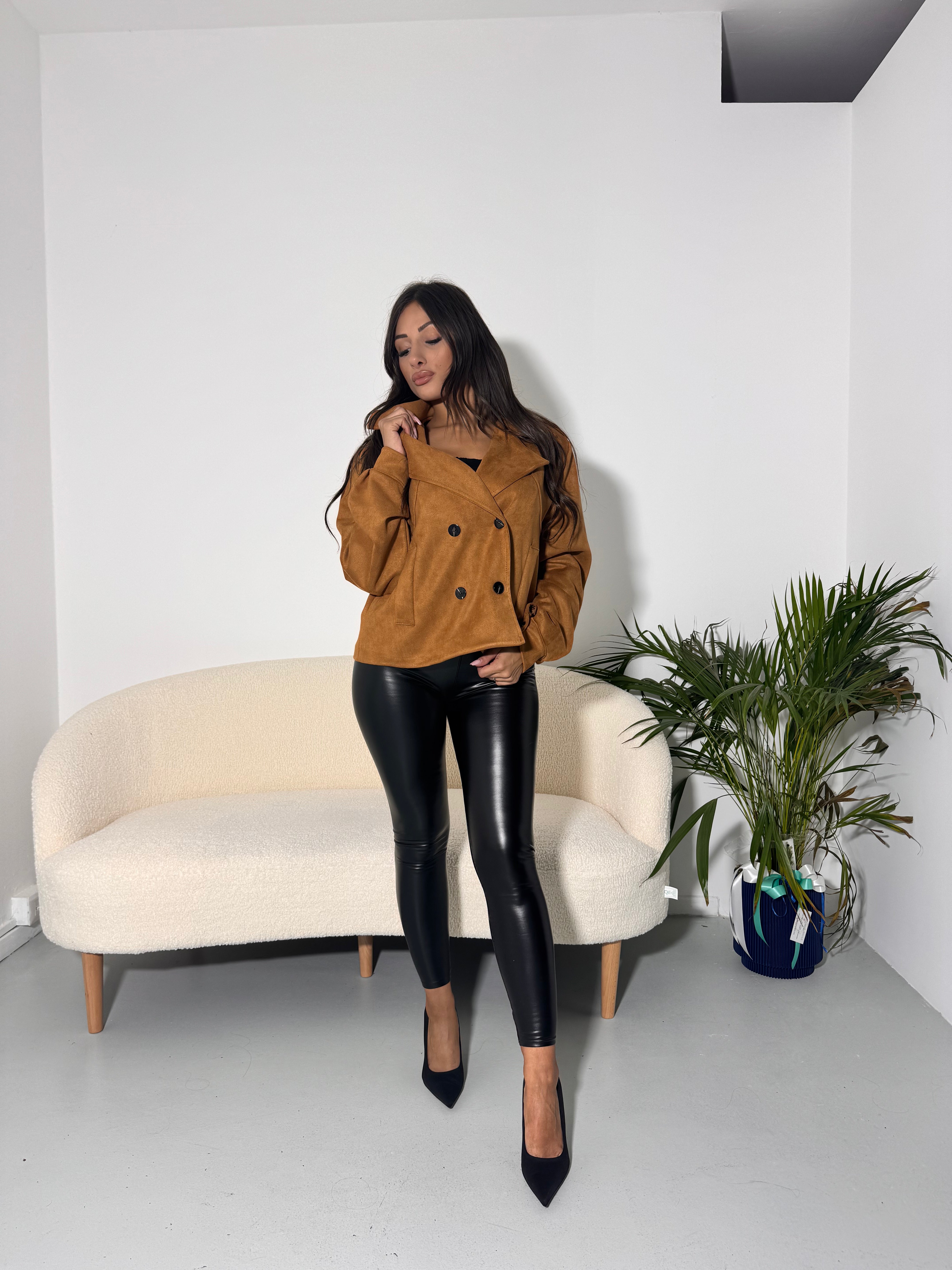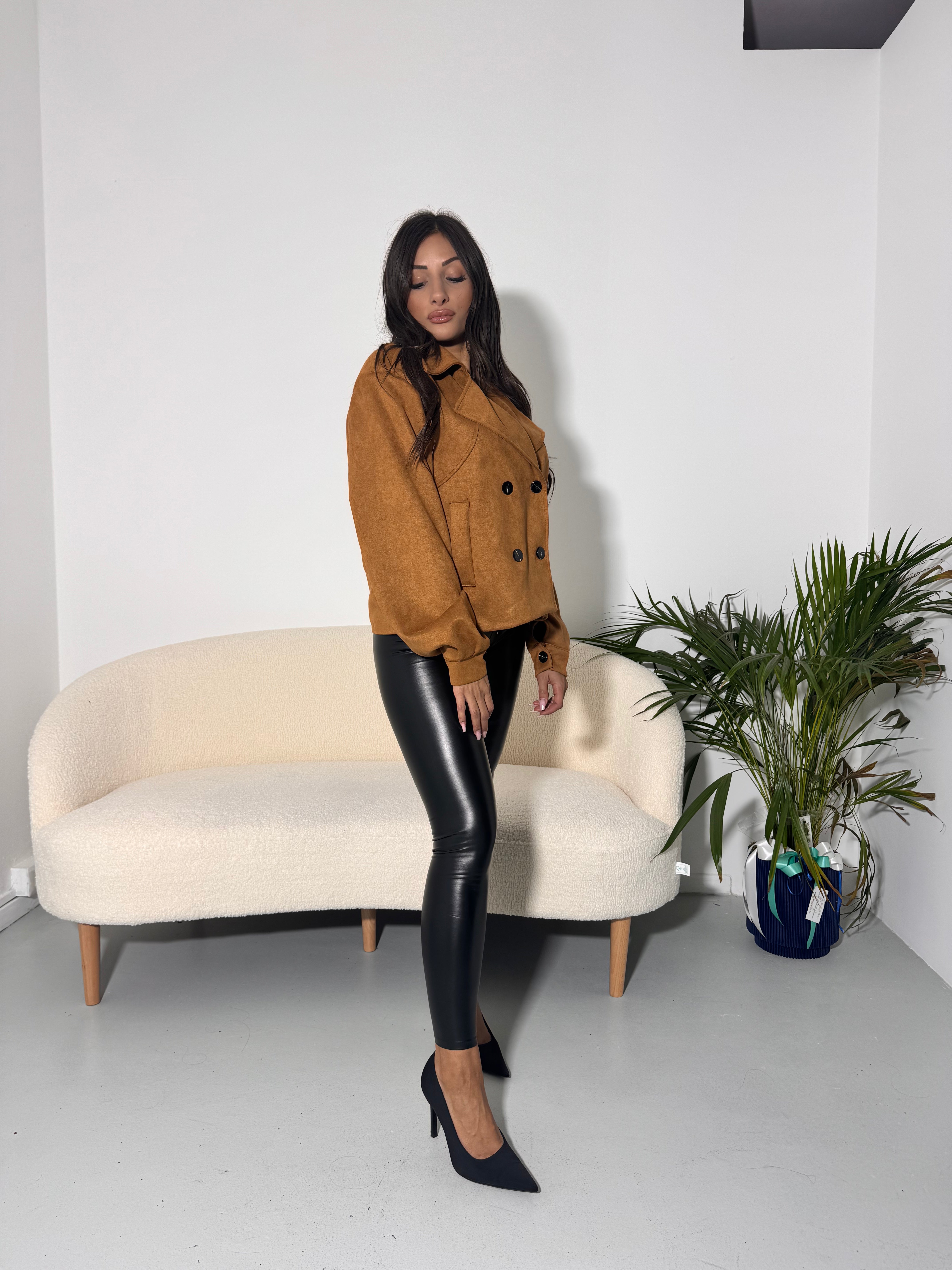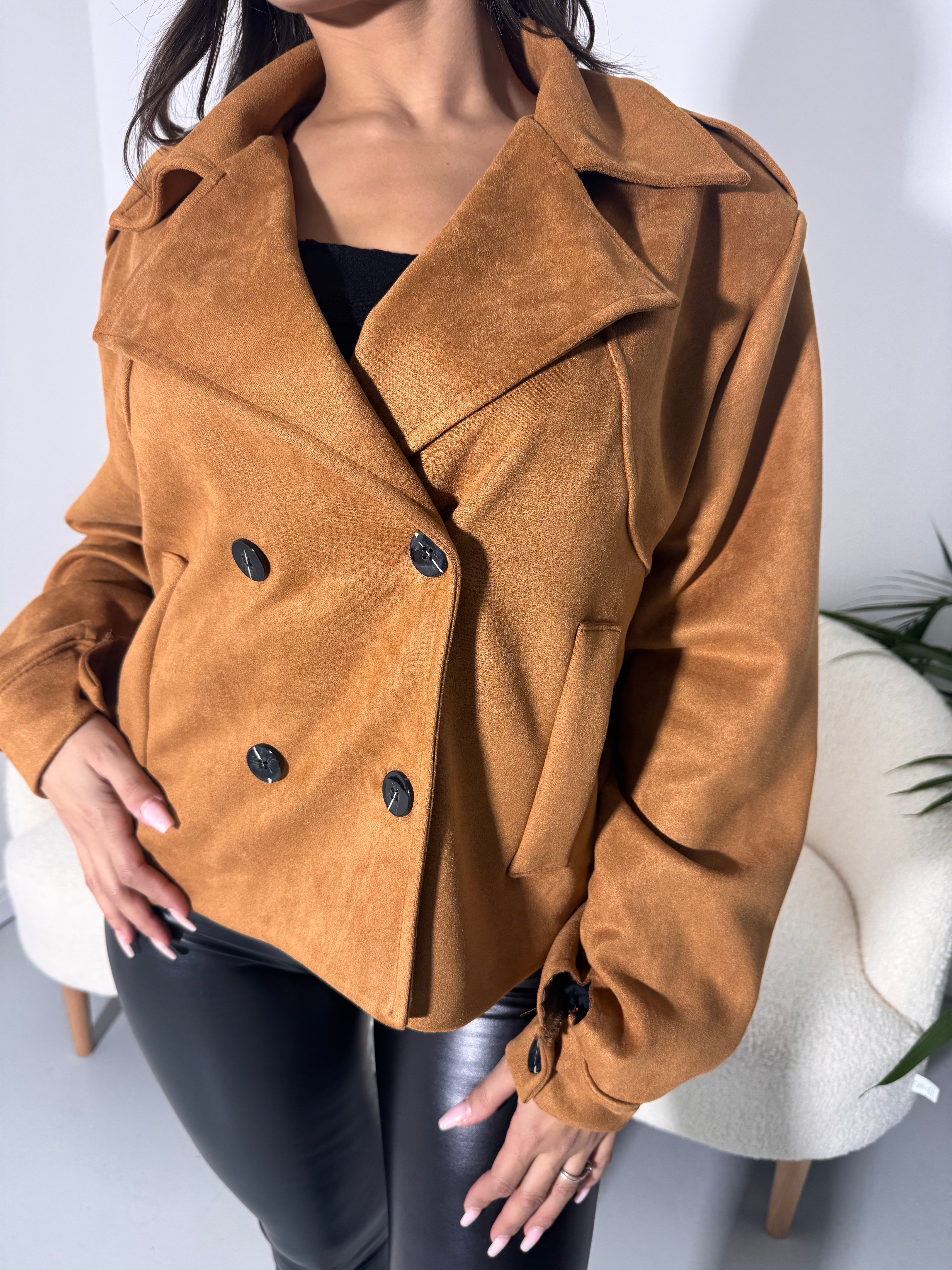Giacca doppiopetto in tessuto effetto scamosciato, morbidissima al tatto e super chic.
