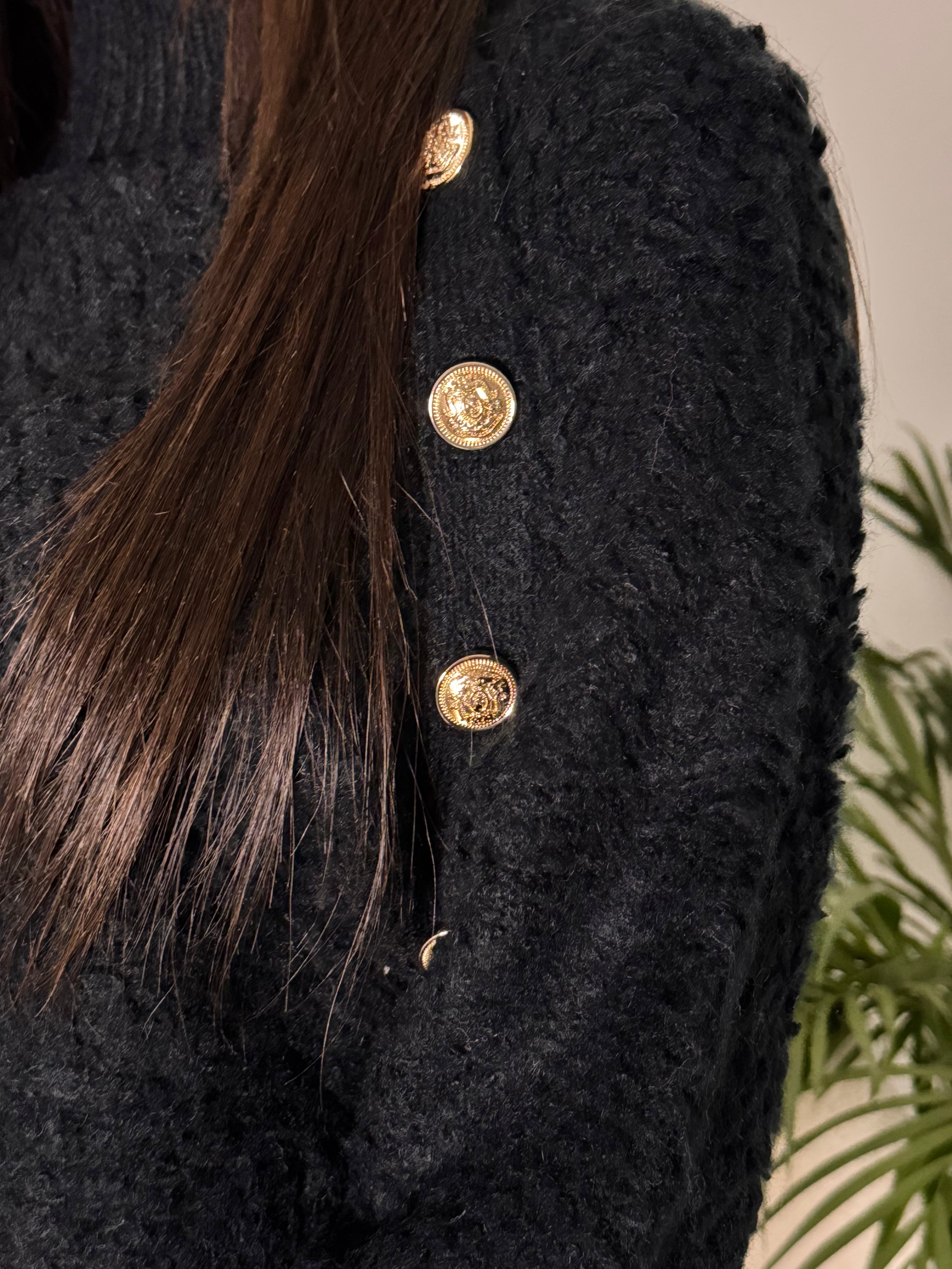 Maglione in maglia in coste dal taglio morbido, con collo rotondo e dettagli di bottoni d'orati sulle spalle che donano un tocco elegante e raffinato.