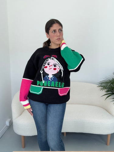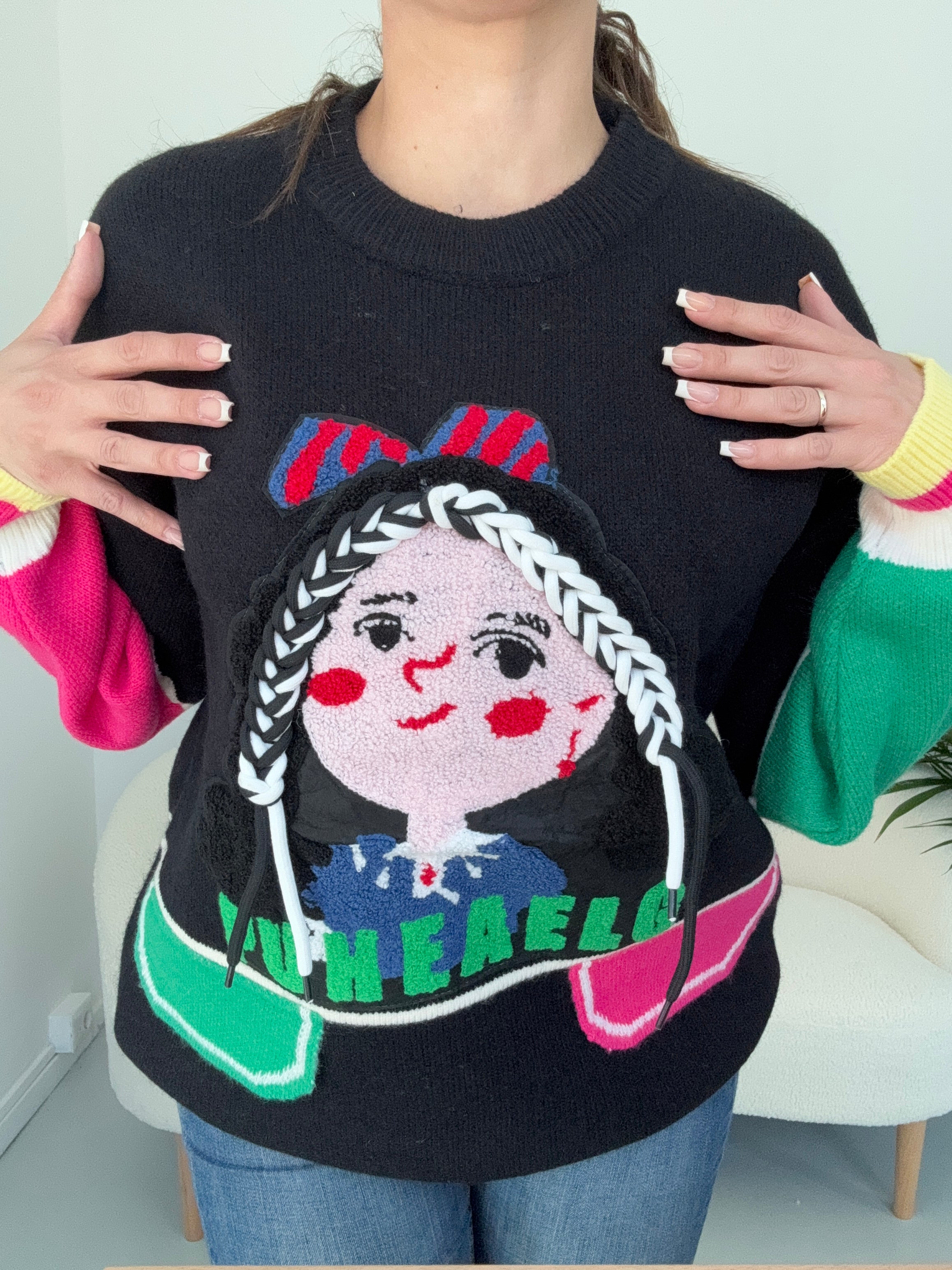 Maxy ricamo frontale con volto stilizzato e scritta decorativa.
