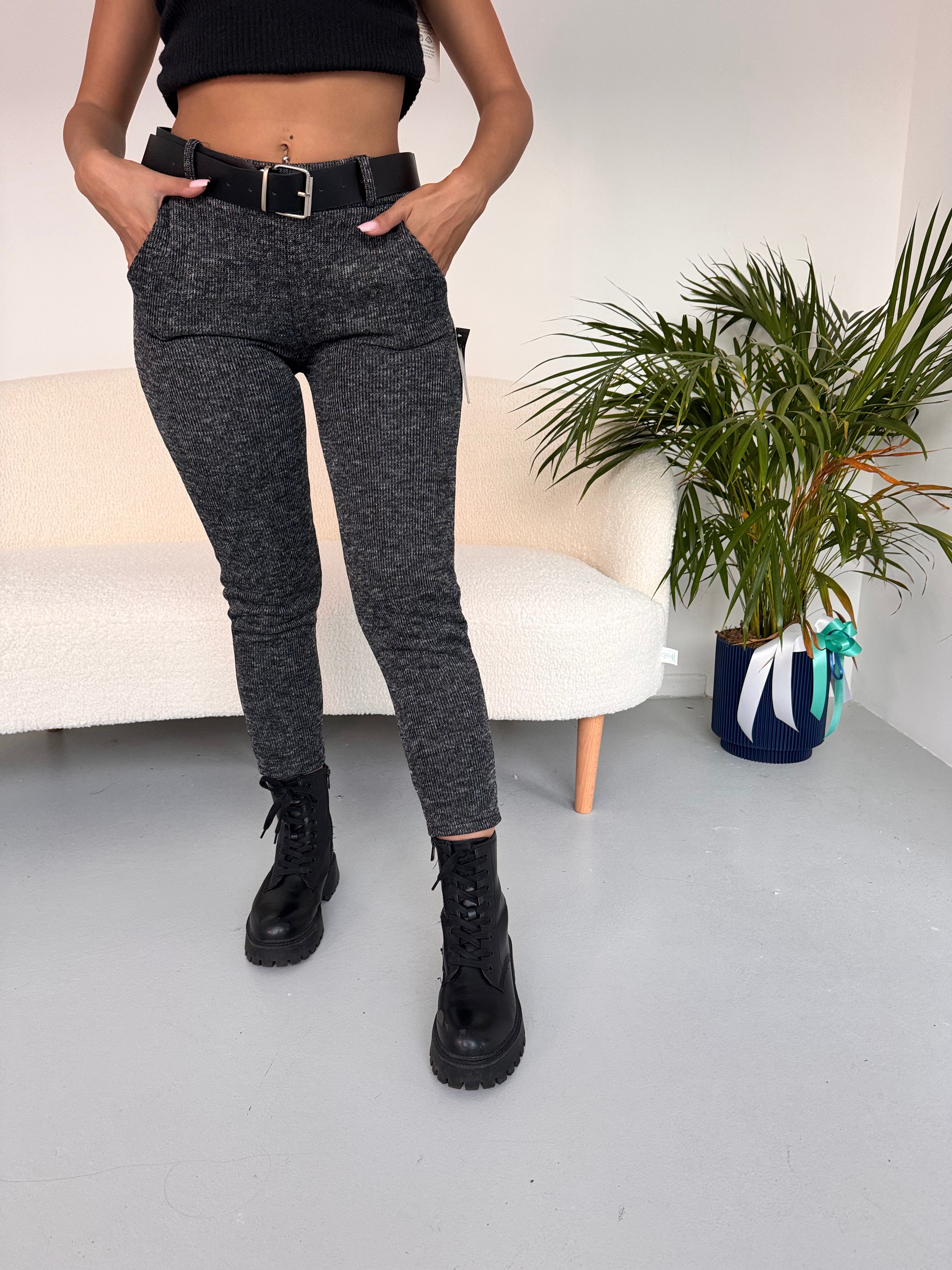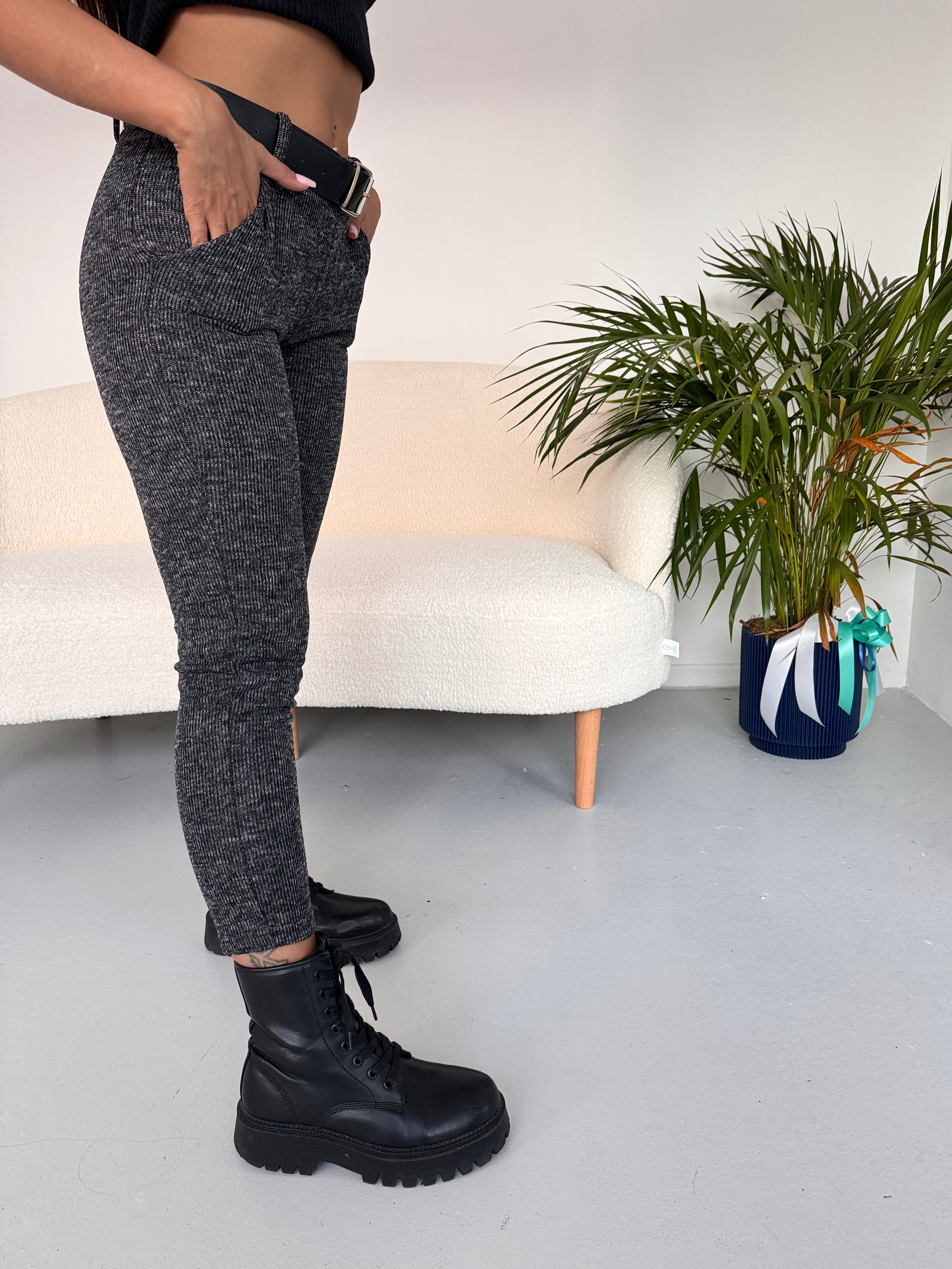 Taglio moderno a sigaretta, dotato di tasche laterali e vita elasticizzata con passanti.