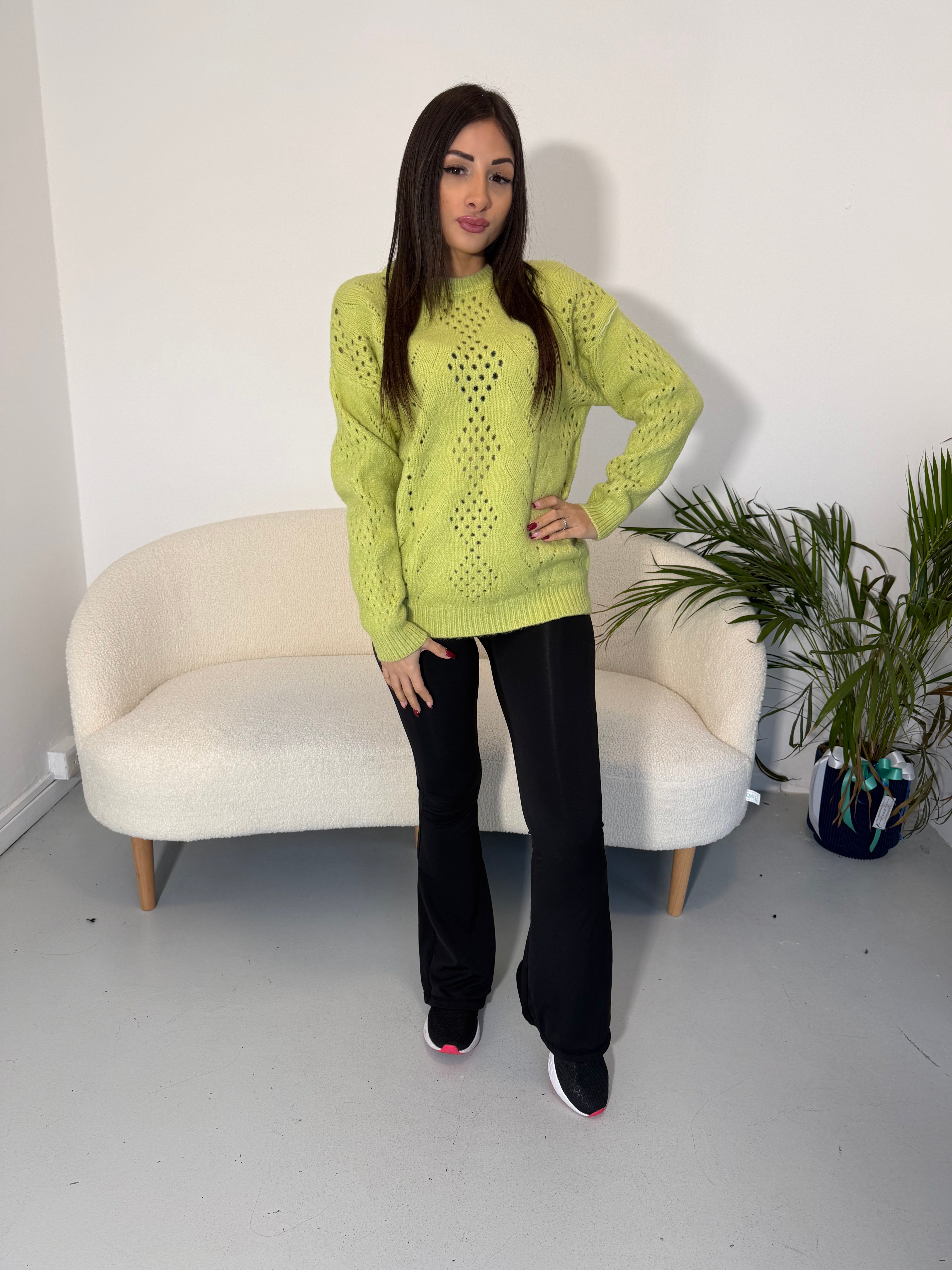 Maglione in maglia morbida dal colore verde lime luminoso, impreziosito da una lavorazione traforata che crea un gioco di texture.