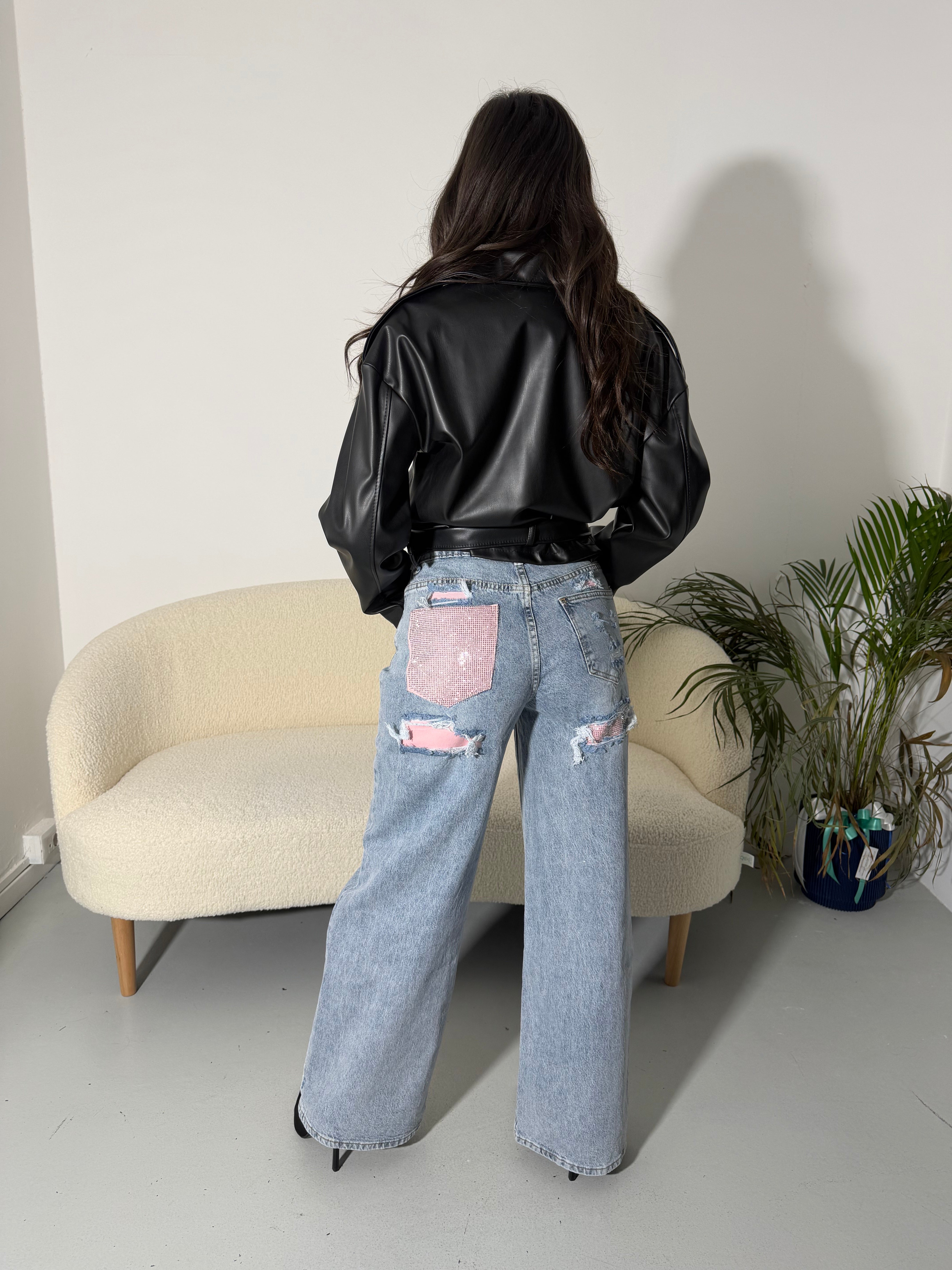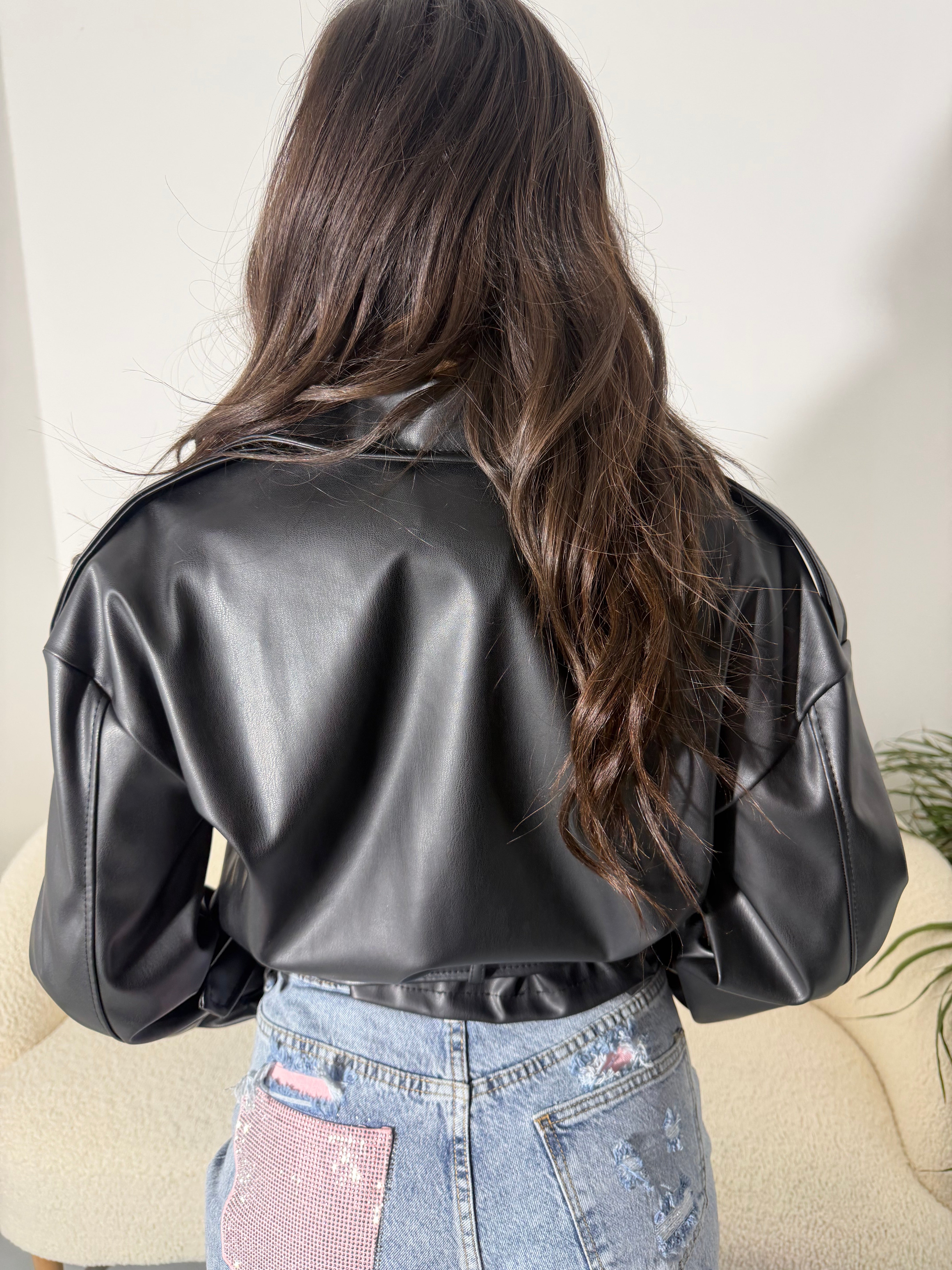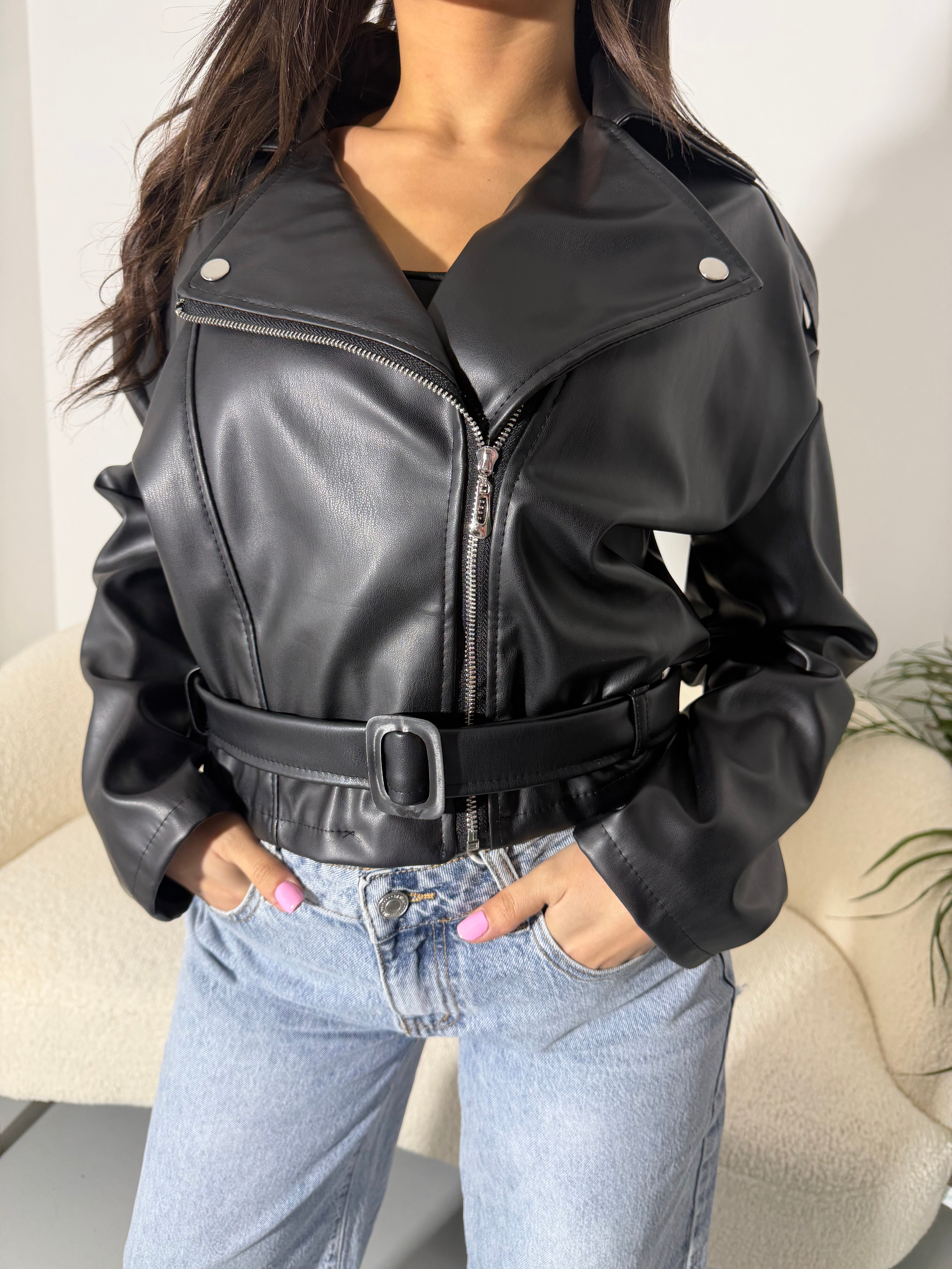 Giacca corta in ecopelle morbida con zip frontale e cintura in vita.