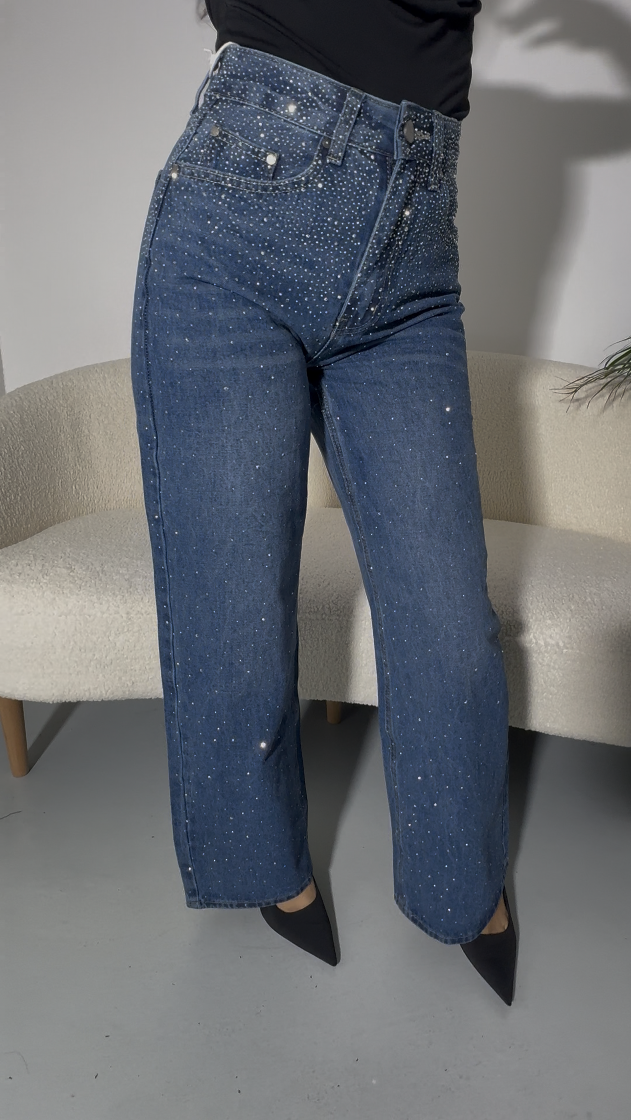 Realizzati in denim morbido e confortevole, presentano una cascata di micro strass luminosi che dalla vita scendono lungo la gamba, creando un effetto brillante ma elegante.