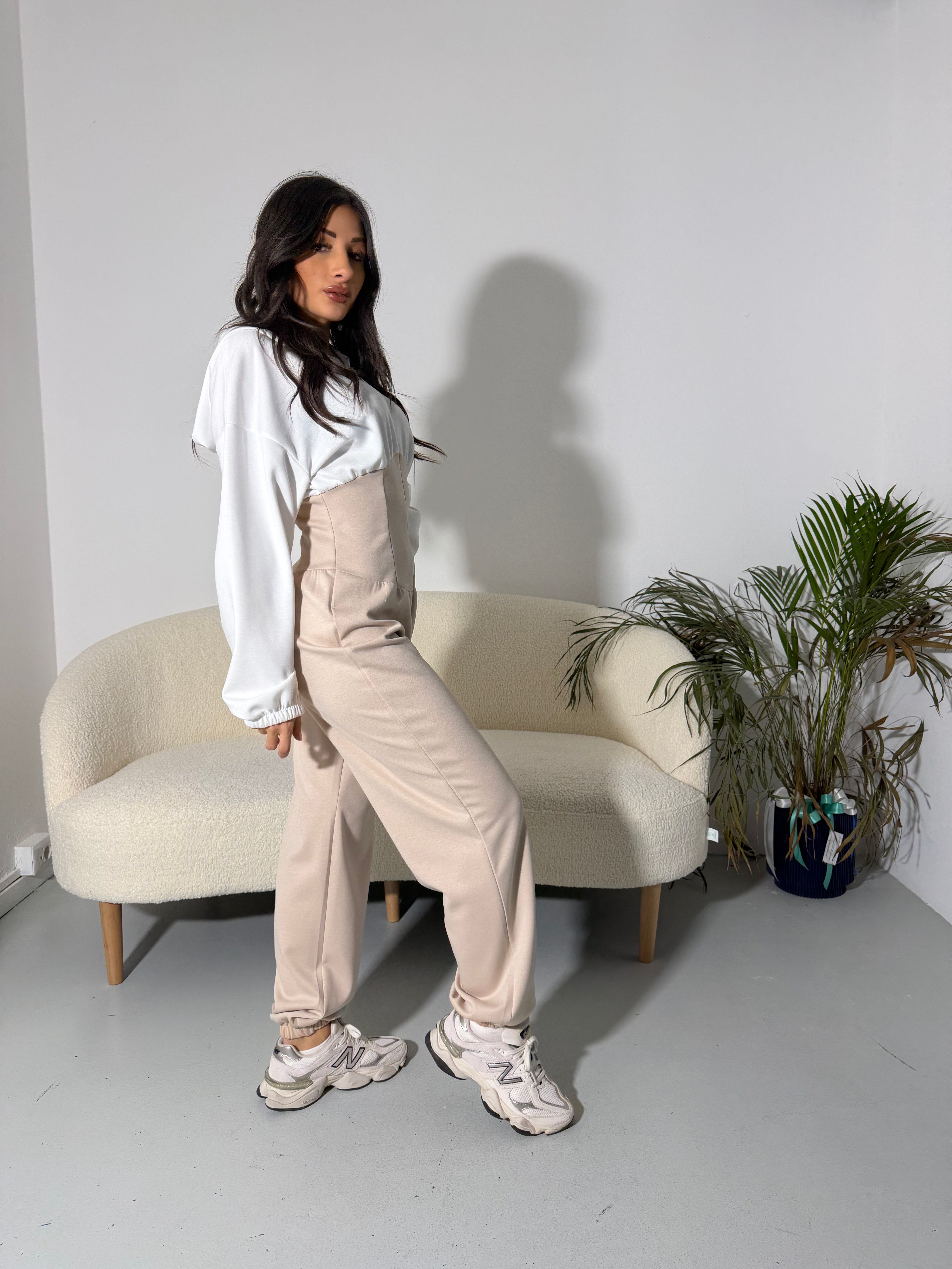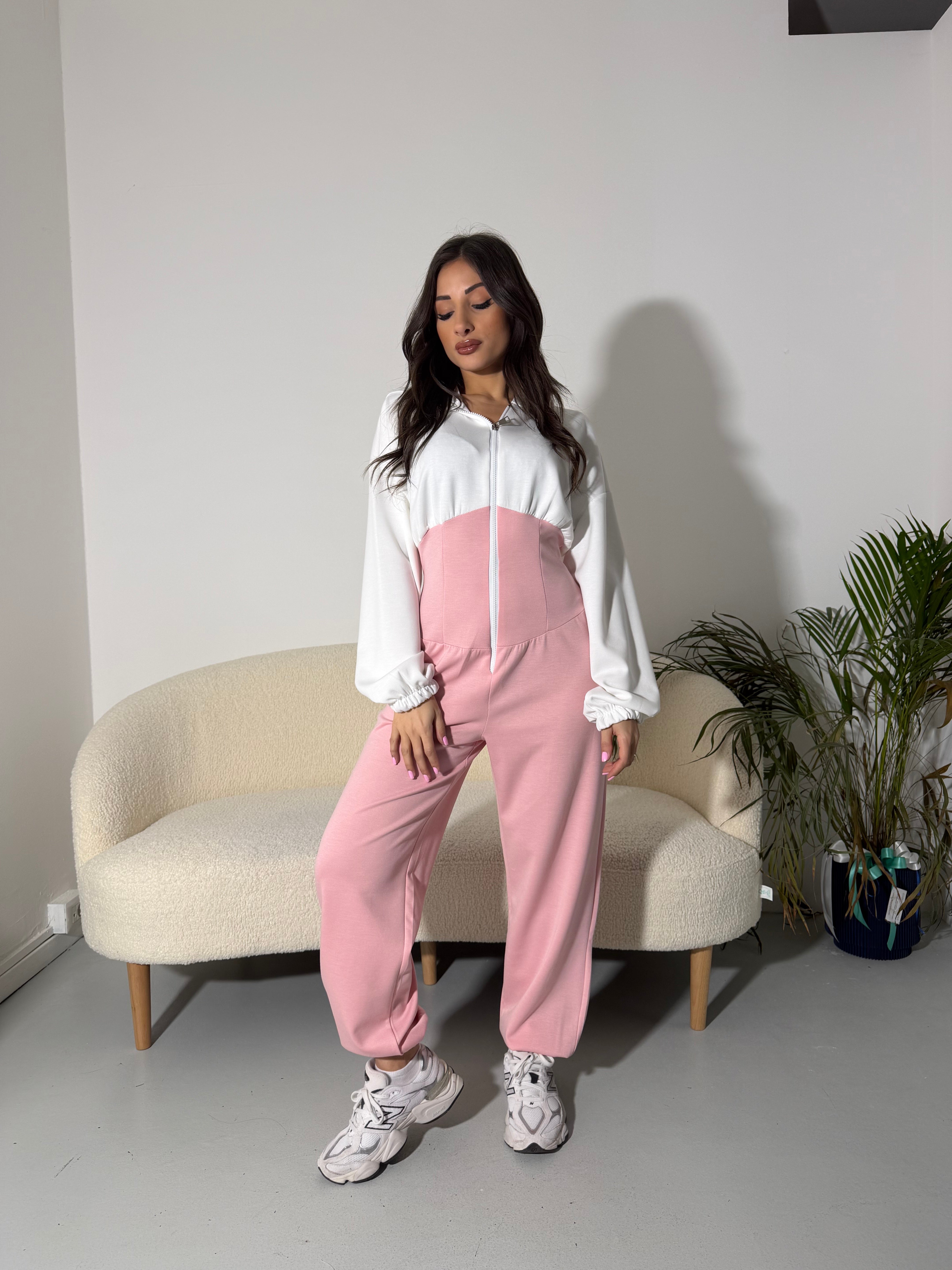 Jumpsuite bicolore con zip frontale e vita sagomata che valorizza la figura.