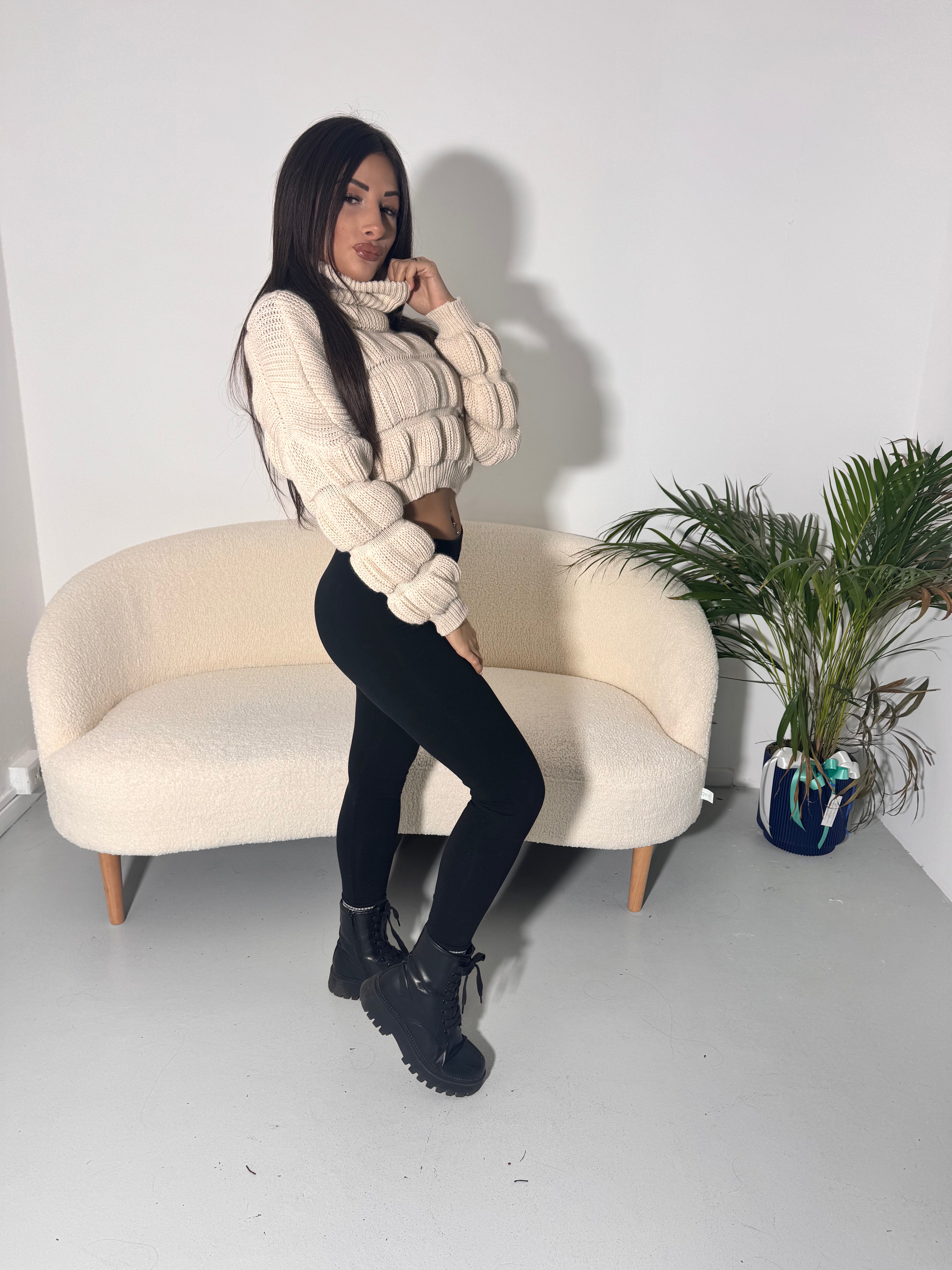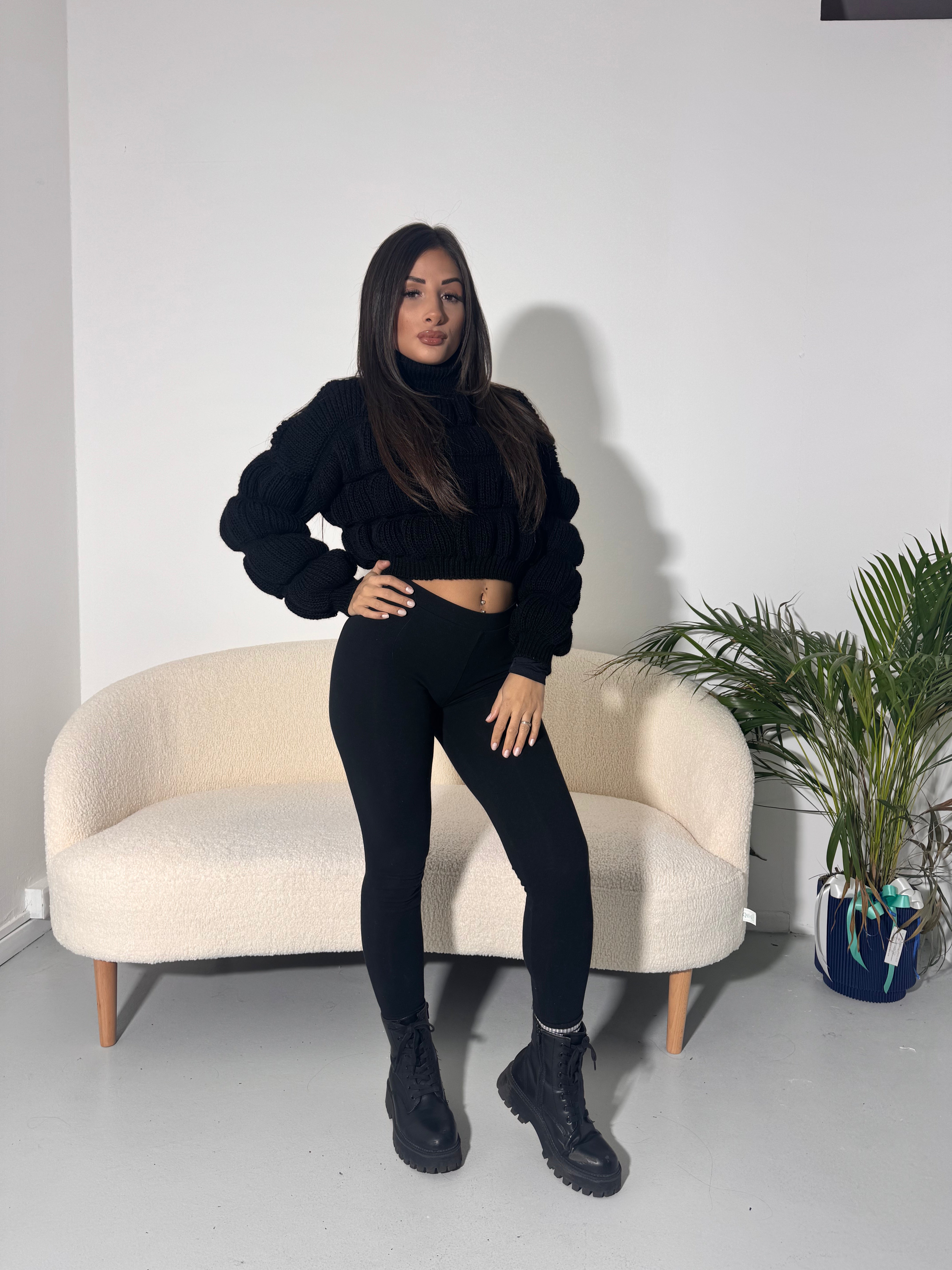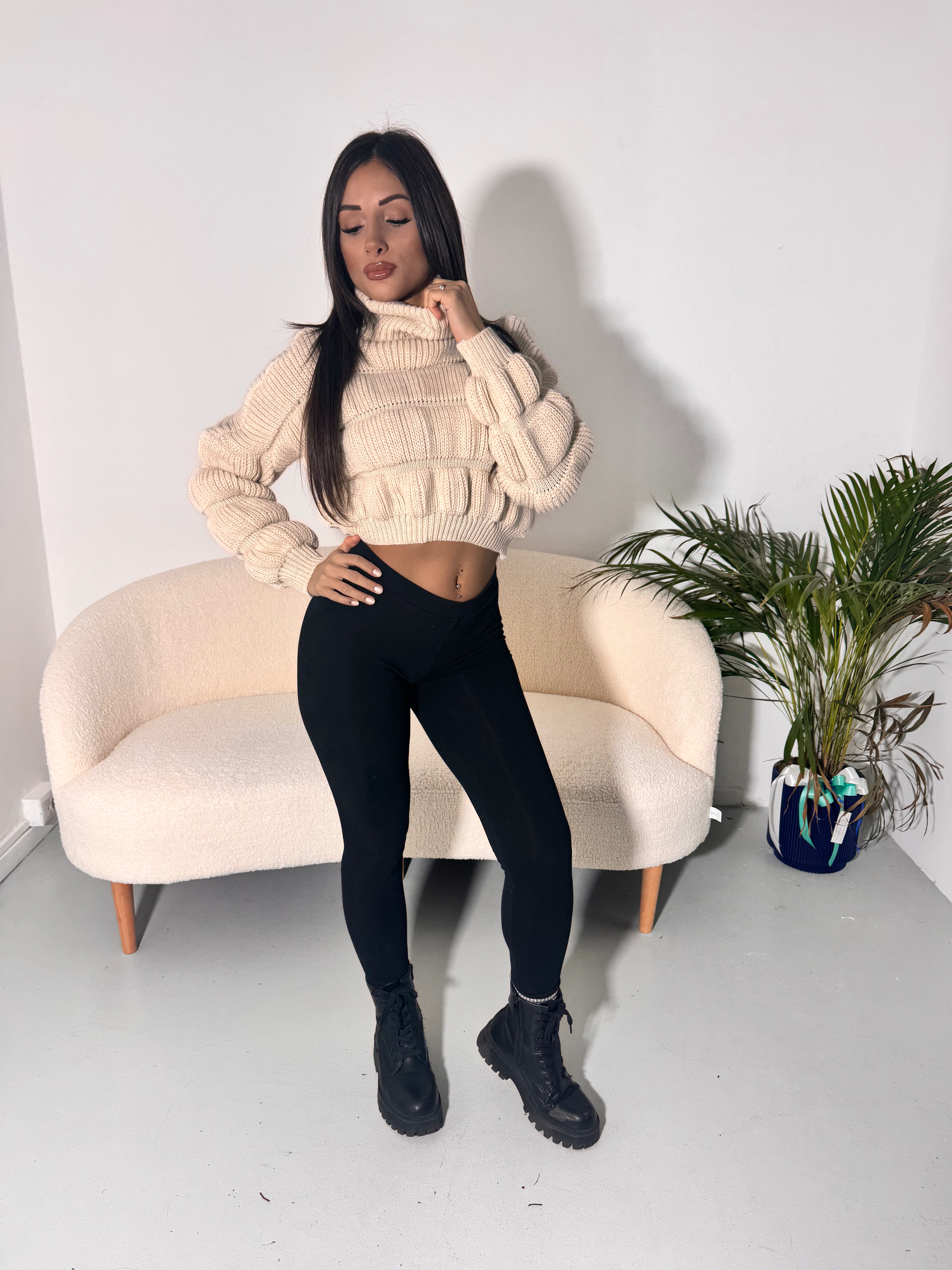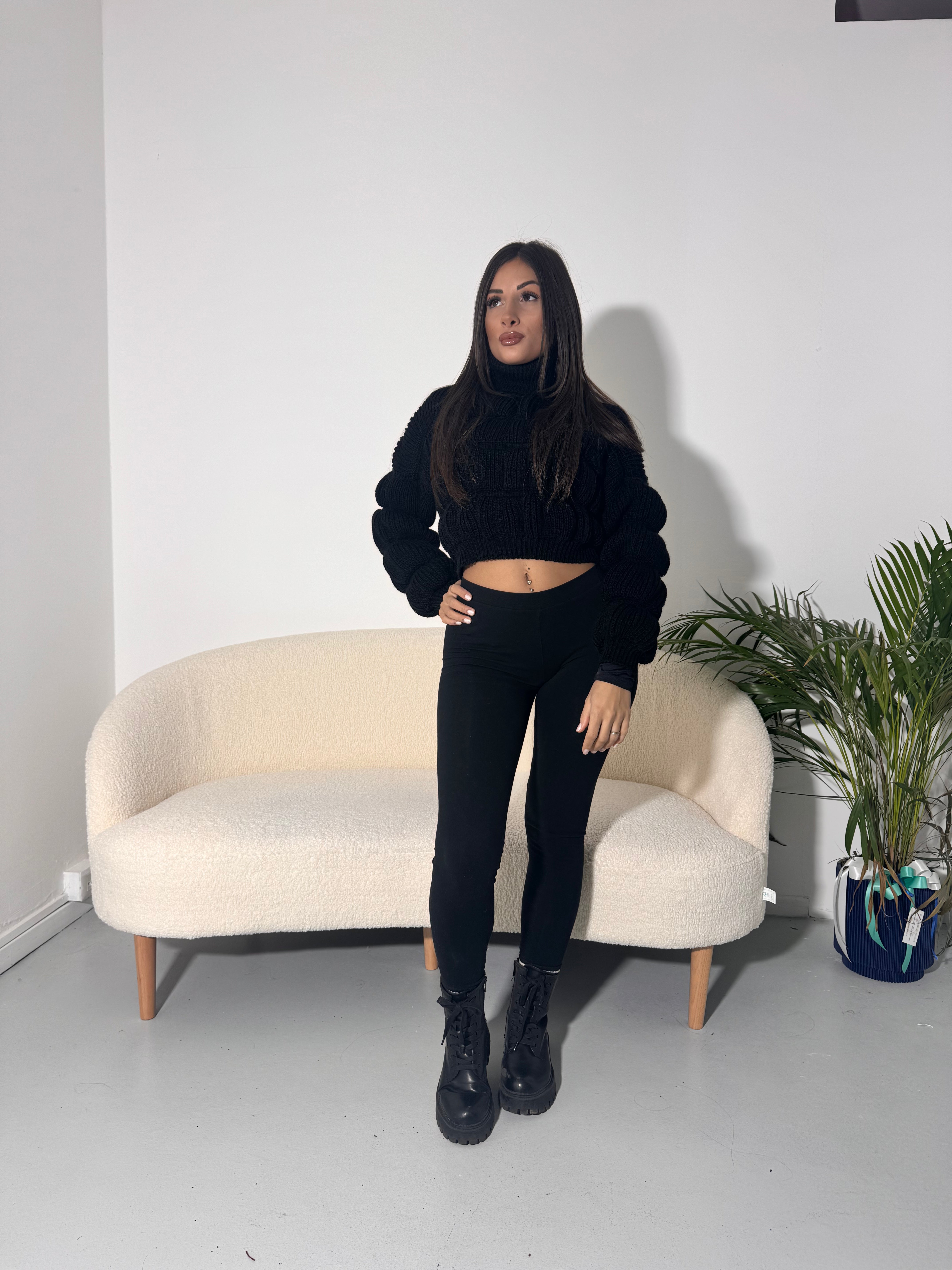 Il modello crop a collo alto slancia la figura e si abbina perfettamente a leggings, jeans o pantaloni a vita alta.