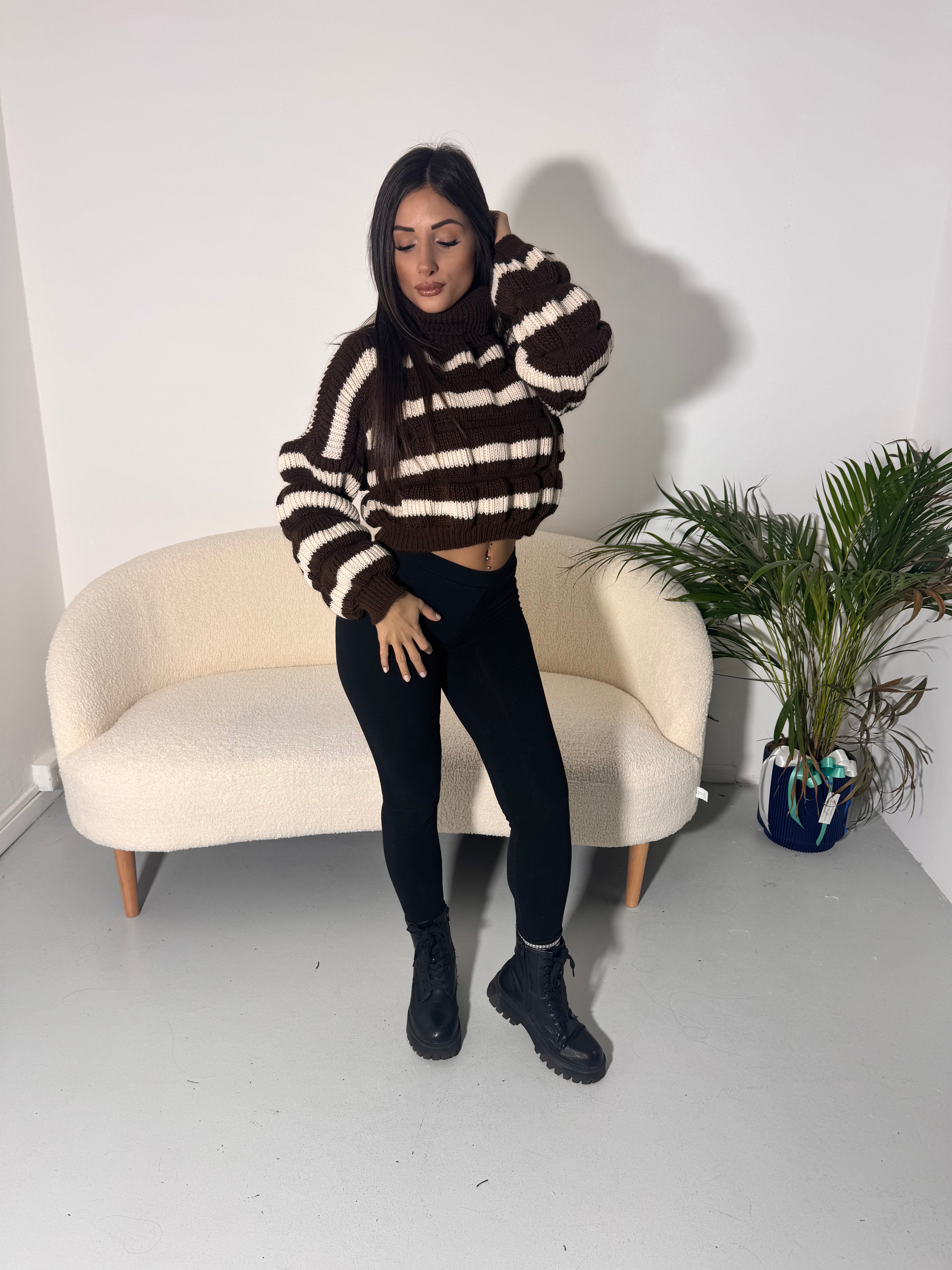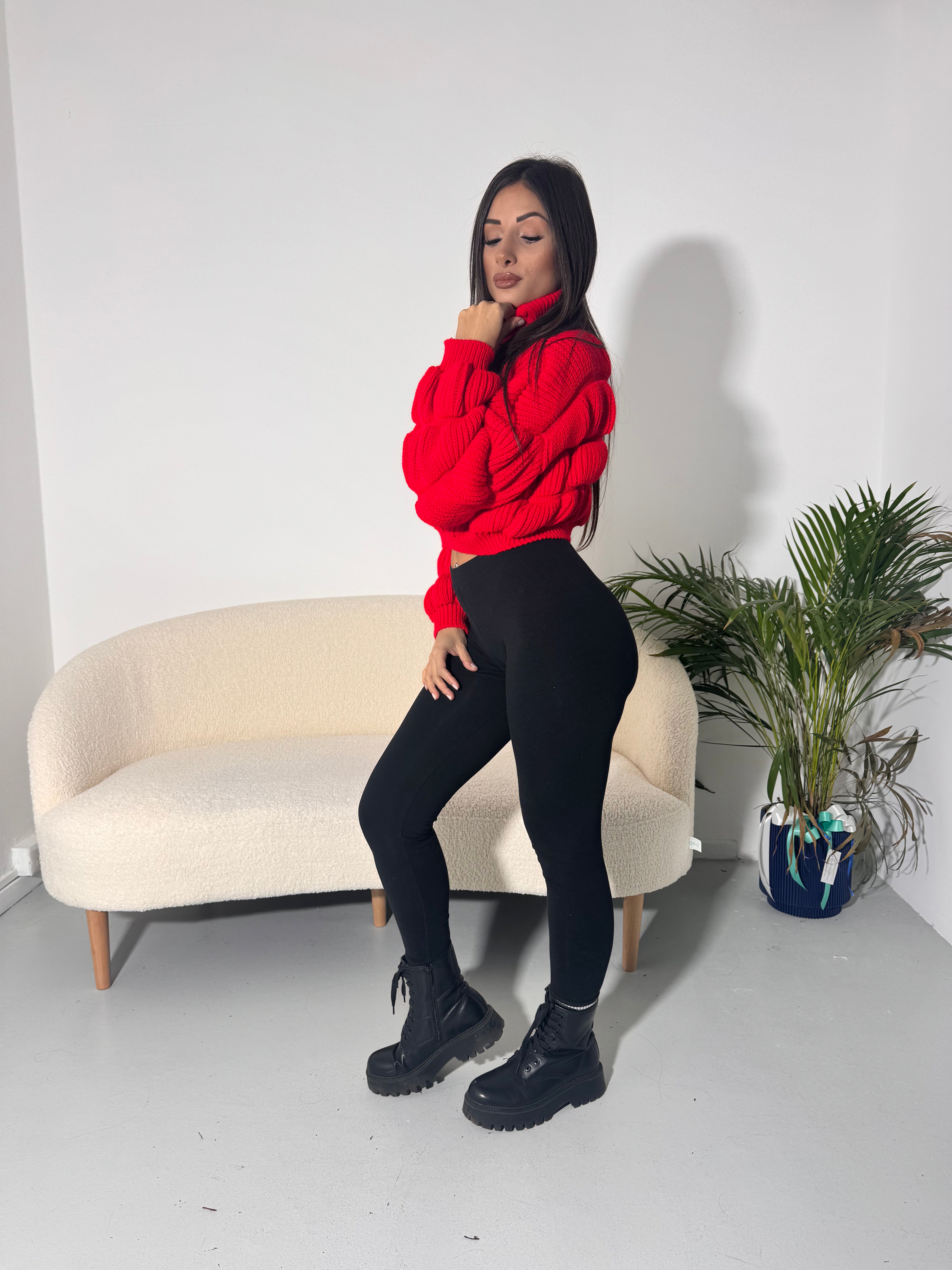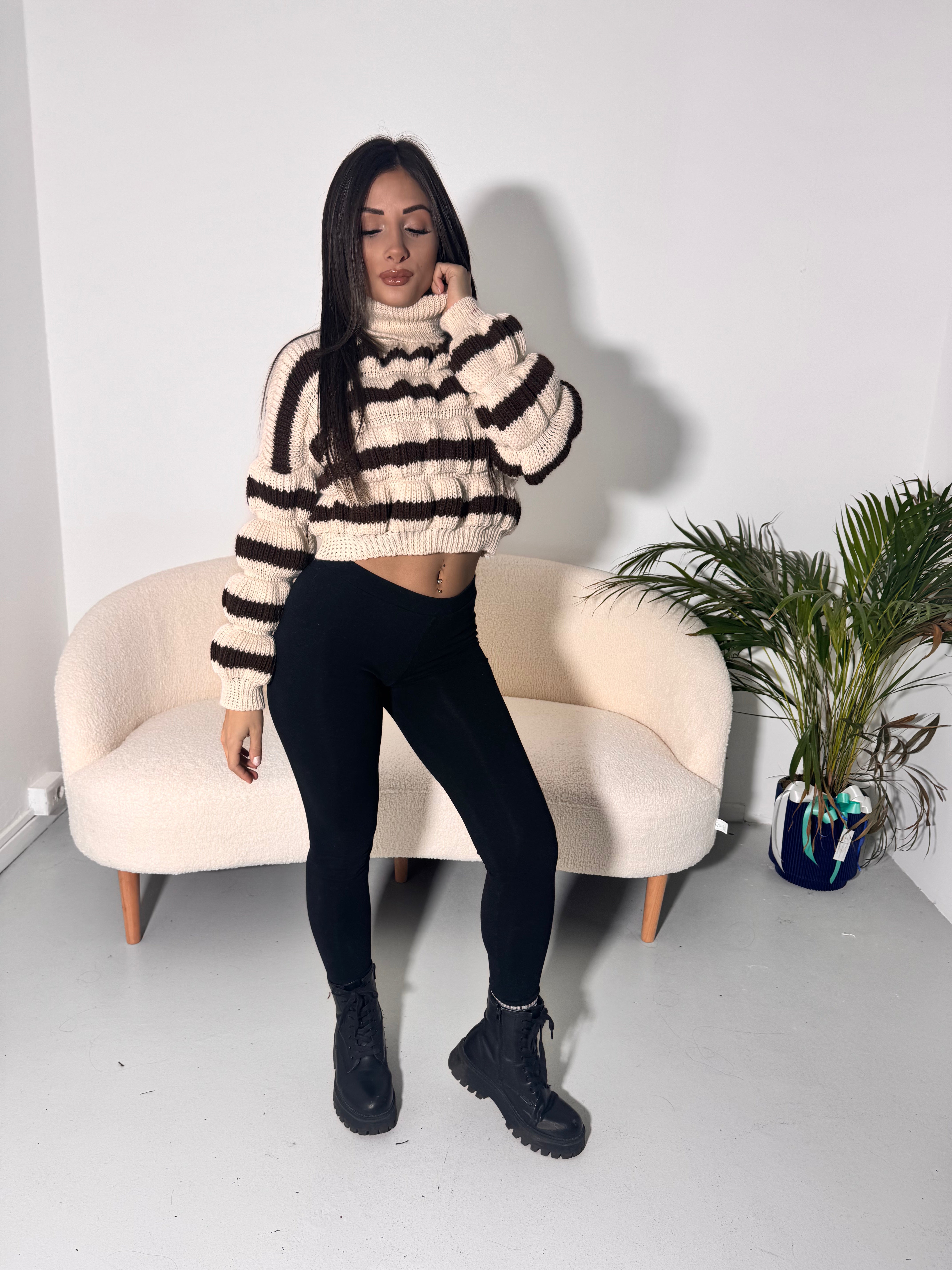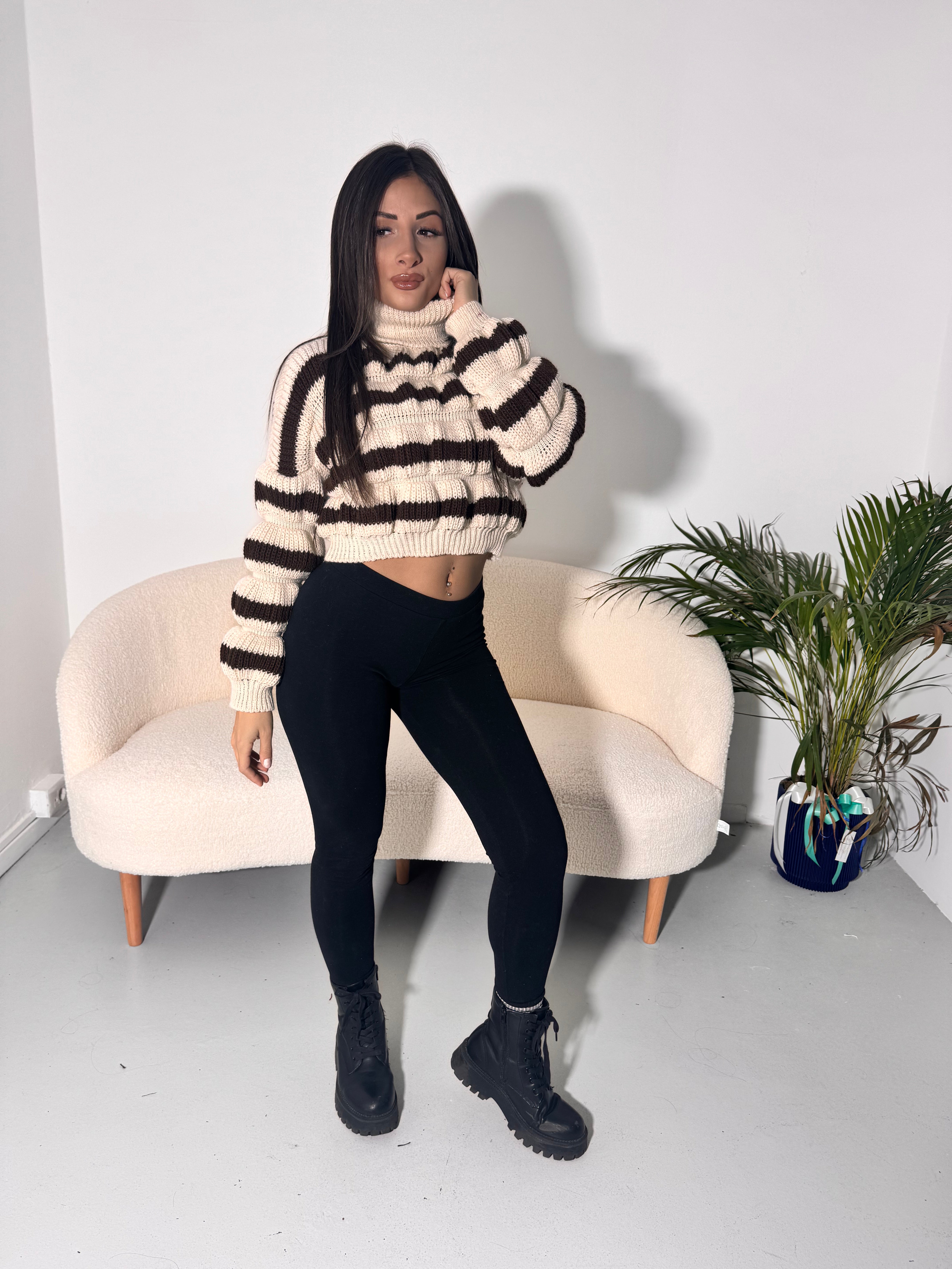 Il modello crop a collo alto slancia la figura e si abbina perfettamente a leggings, jeans o pantaloni a vita alta.